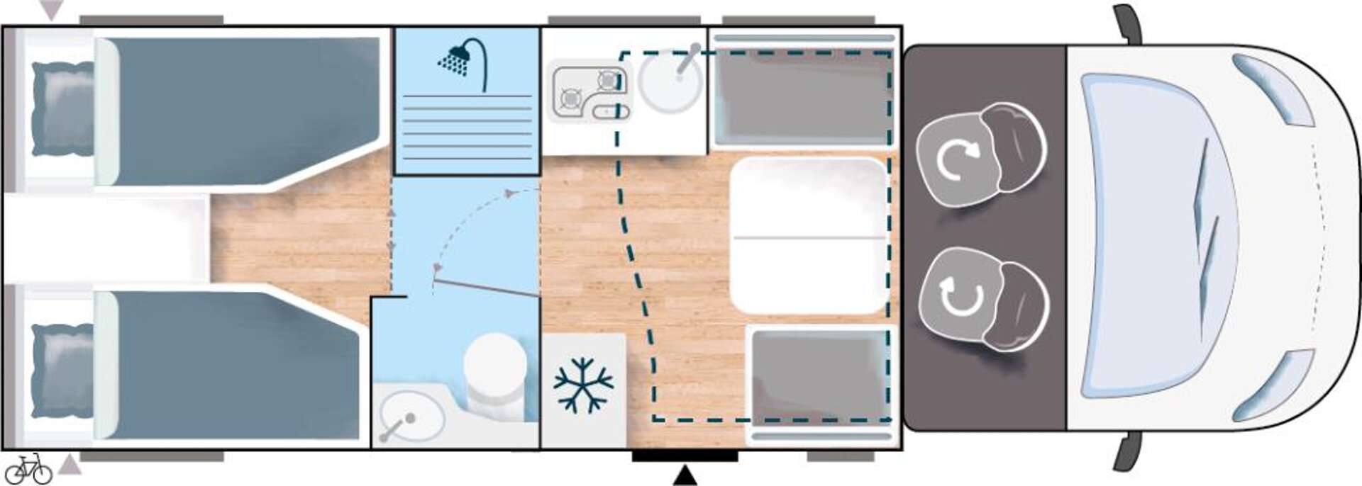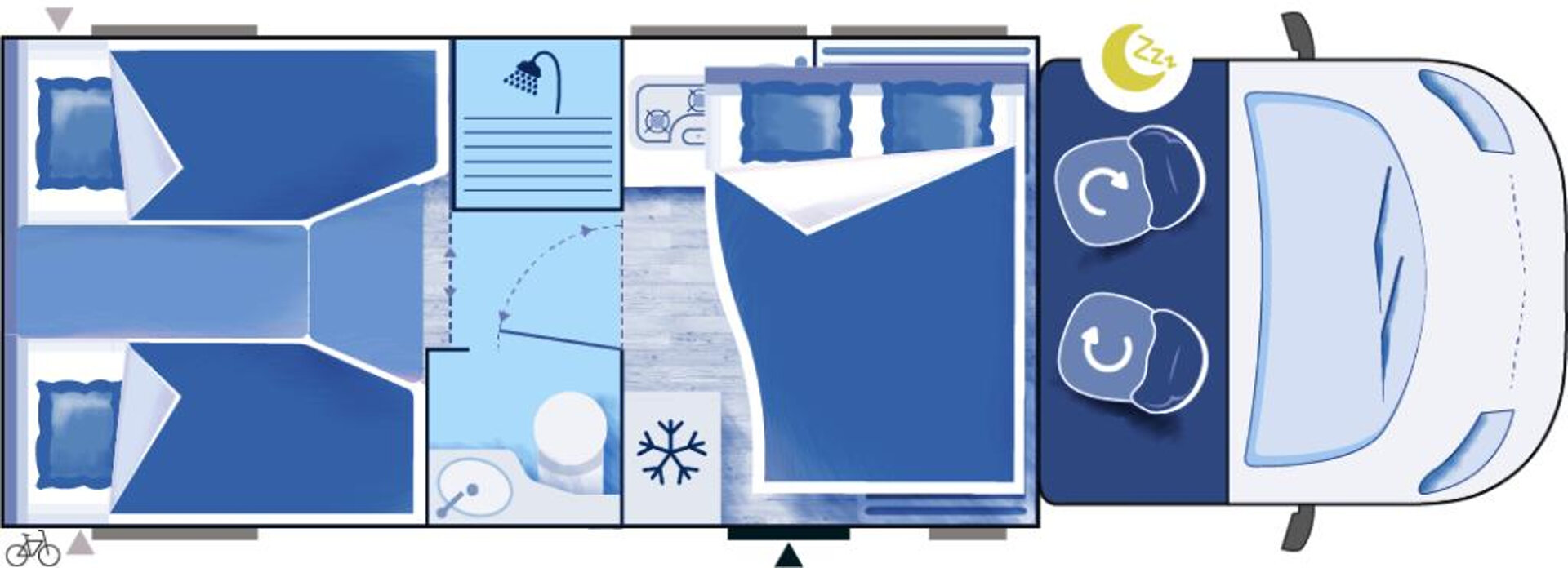- 2 oddzielne łóżka wzdłużne z możliwością połączenia w łoże małżeńskie