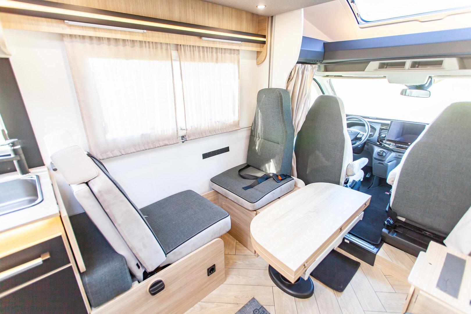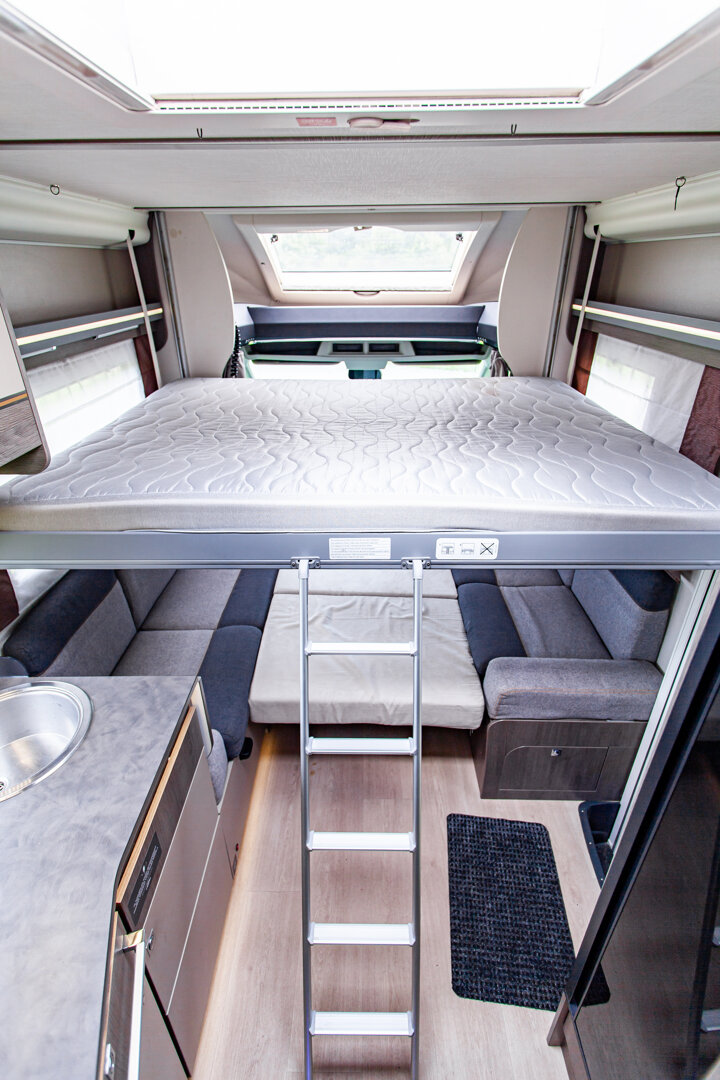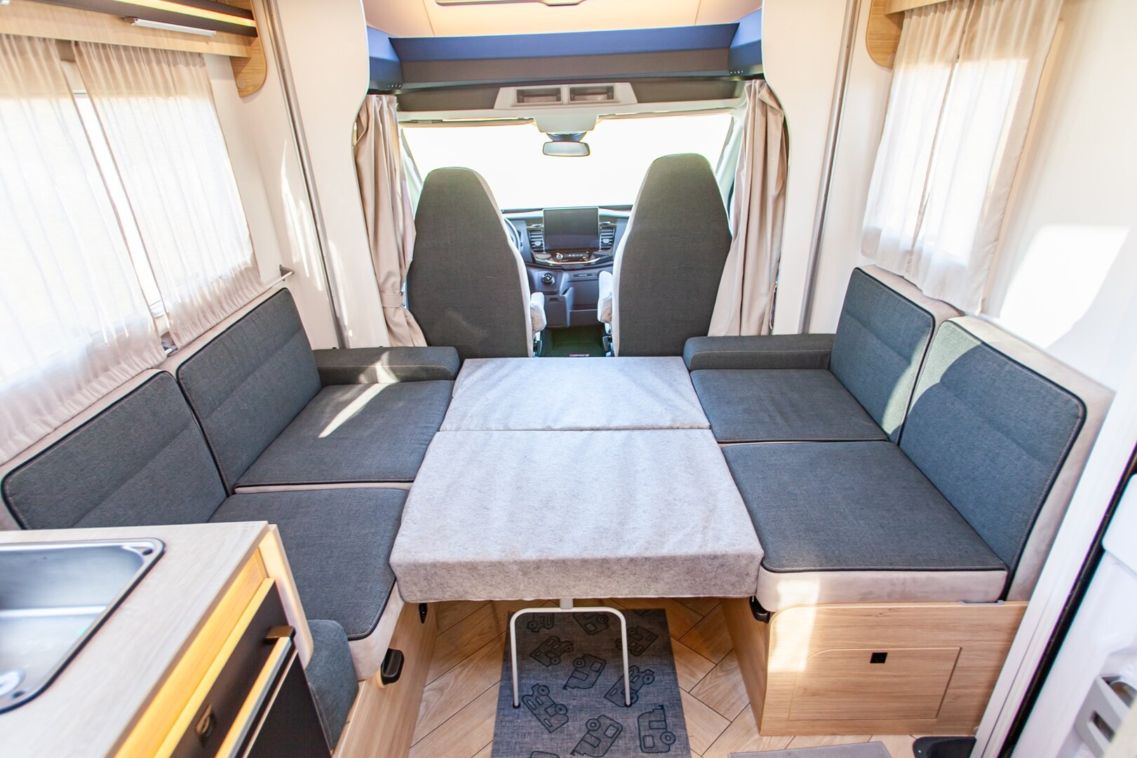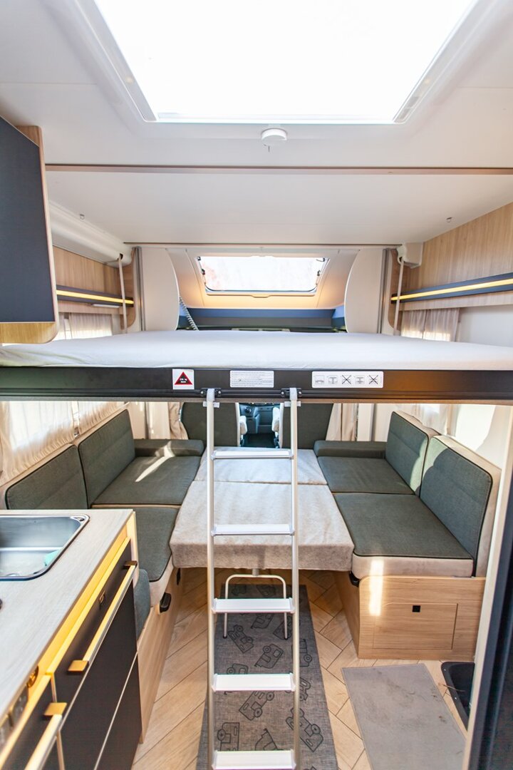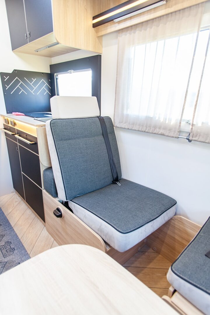 Ten niskoprofilowy kamper z salonem maxi twarzą w twarz i pięcioma siedzeniami do jazdy otwiera się w ciepłym i przyjaznym otoczeniu. Wyposażony w mnóstwo innowacji, zapewnia łatwe siedzenie dla pięciu osób i sprytne miejsca do spania. Ten nowy układ daje gwarancję komfortu zarówno w wersji dziennej, jak i nocnej.