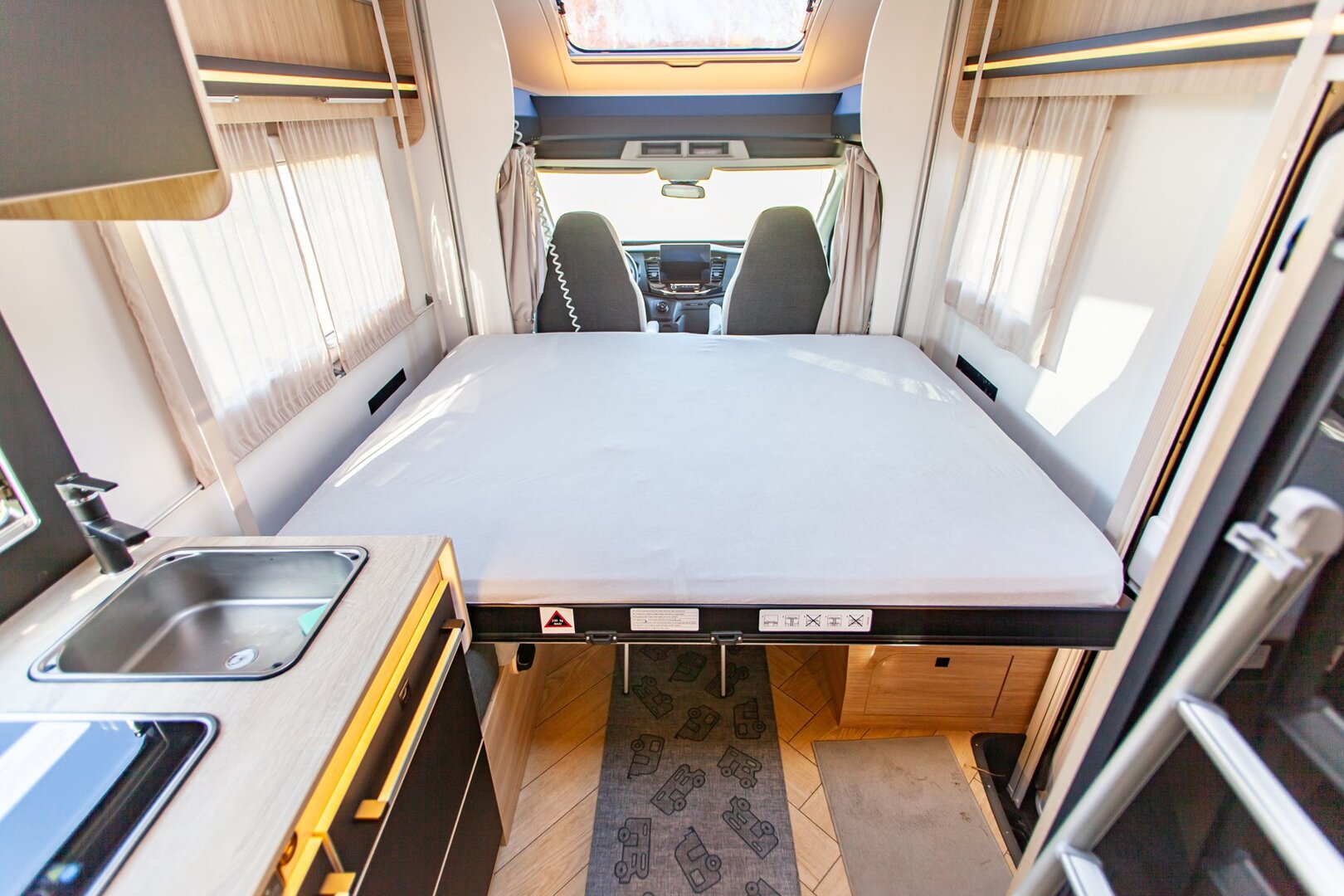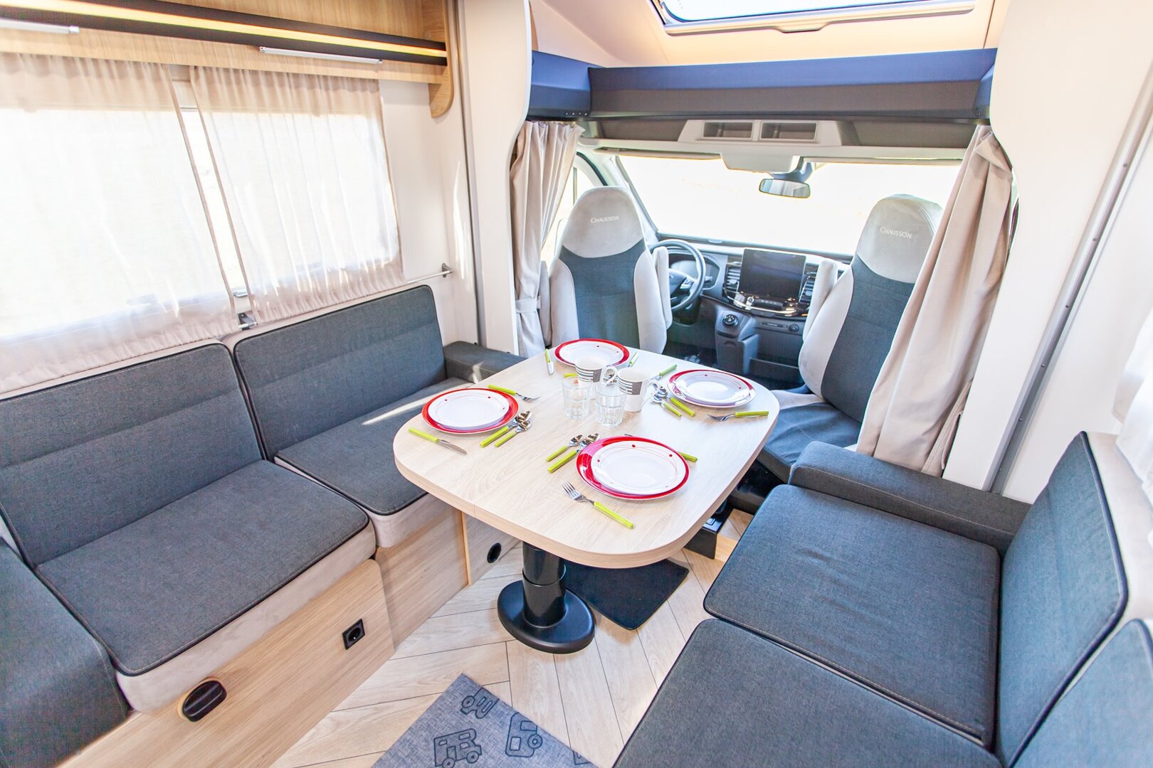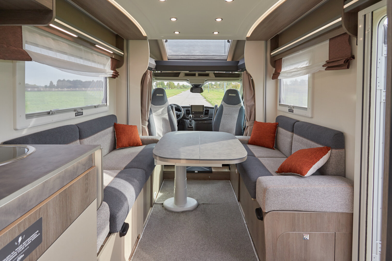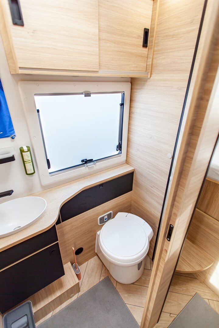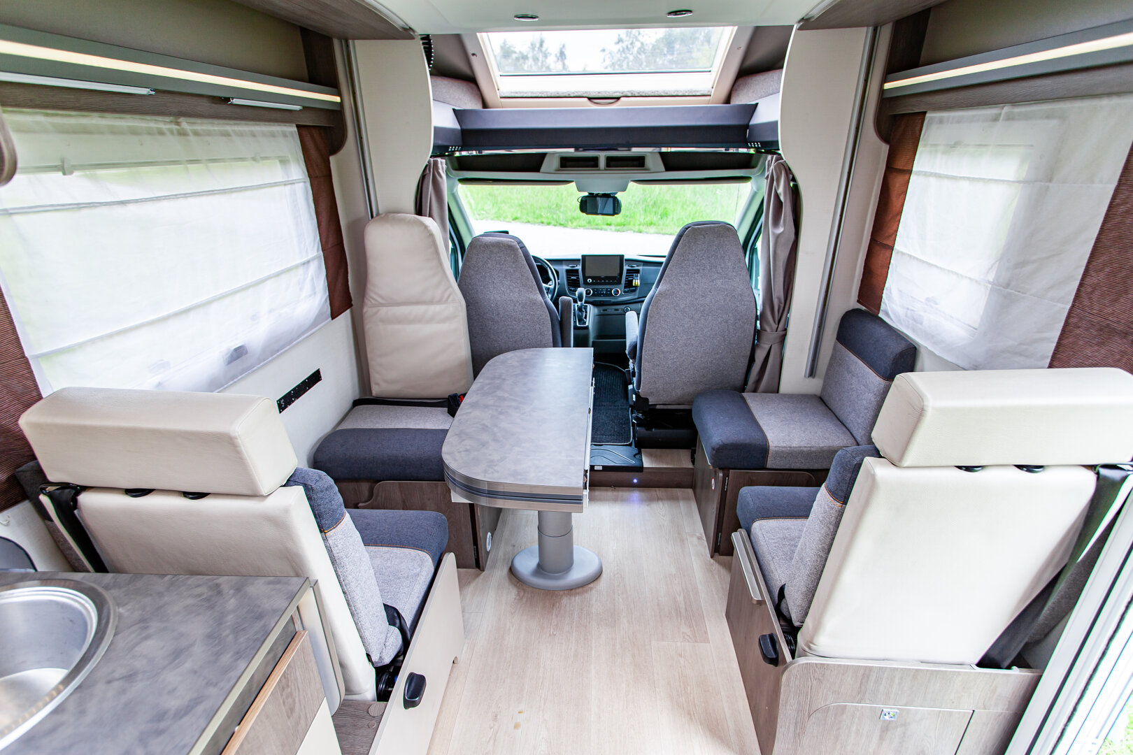 Ten niskoprofilowy kamper z salonem maxi twarzą w twarz i pięcioma siedzeniami do jazdy otwiera się w ciepłym i przyjaznym otoczeniu. Wyposażony w mnóstwo innowacji, zapewnia łatwe siedzenie dla pięciu osób i sprytne miejsca do spania. Ten nowy układ daje gwarancję komfortu zarówno w wersji dziennej, jak i nocnej.