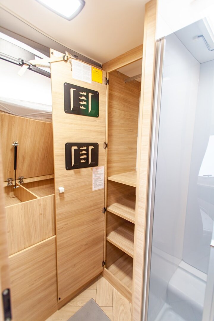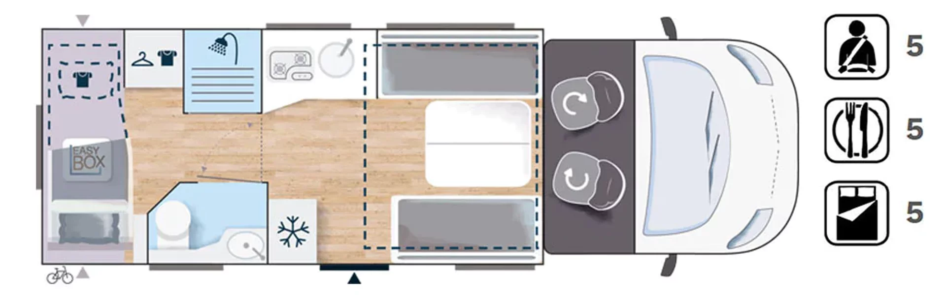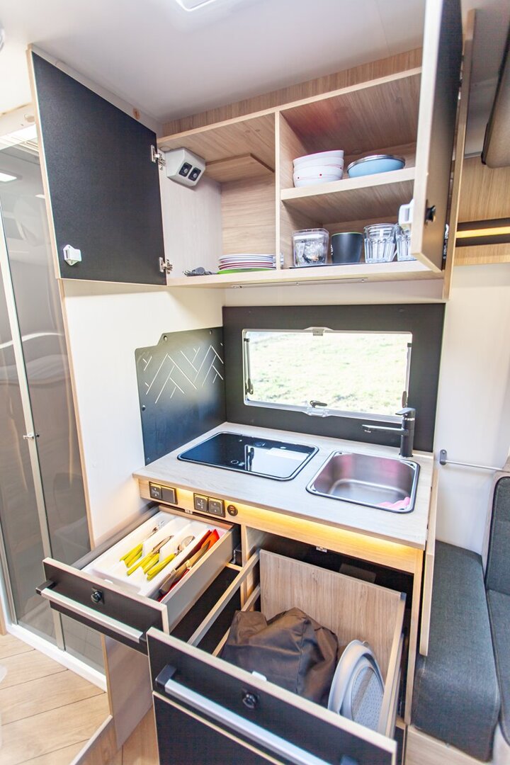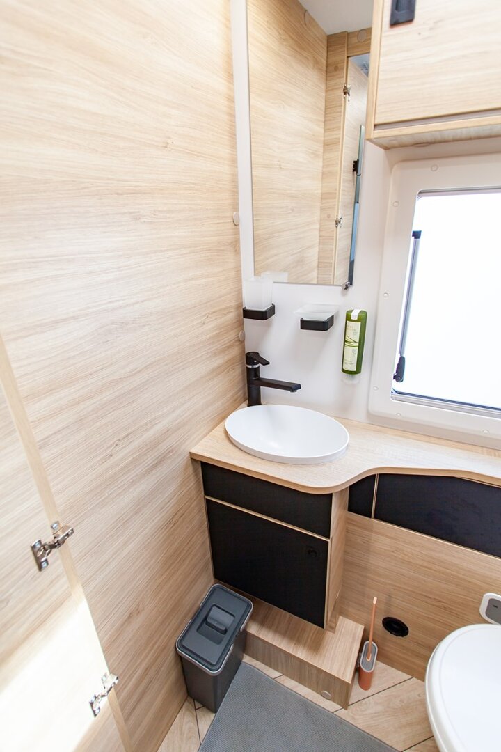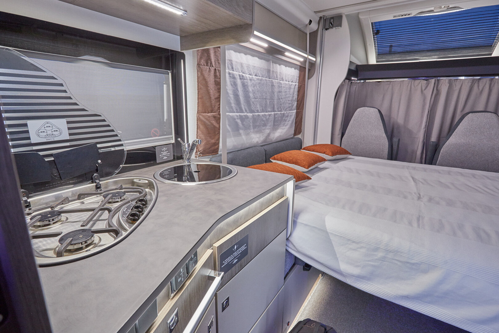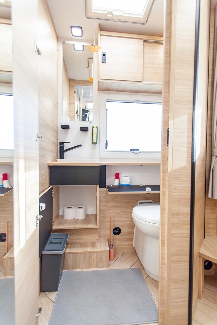 Ten niskoprofilowy kamper z salonem maxi twarzą w twarz i pięcioma siedzeniami do jazdy otwiera się w ciepłym i przyjaznym otoczeniu. Wyposażony w mnóstwo innowacji, zapewnia łatwe siedzenie dla pięciu osób i sprytne miejsca do spania. Ten nowy układ daje gwarancję komfortu zarówno w wersji dziennej, jak i nocnej.