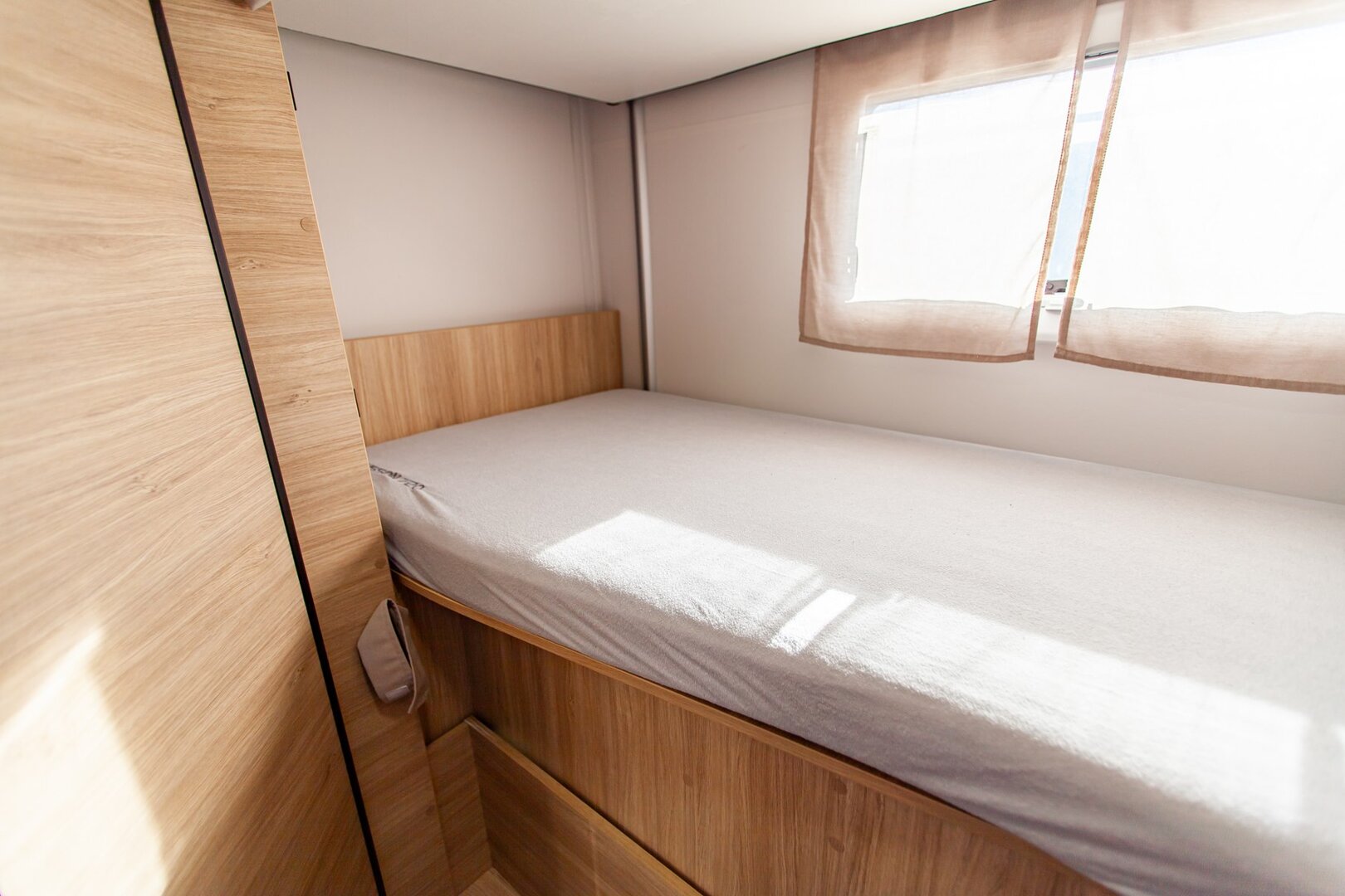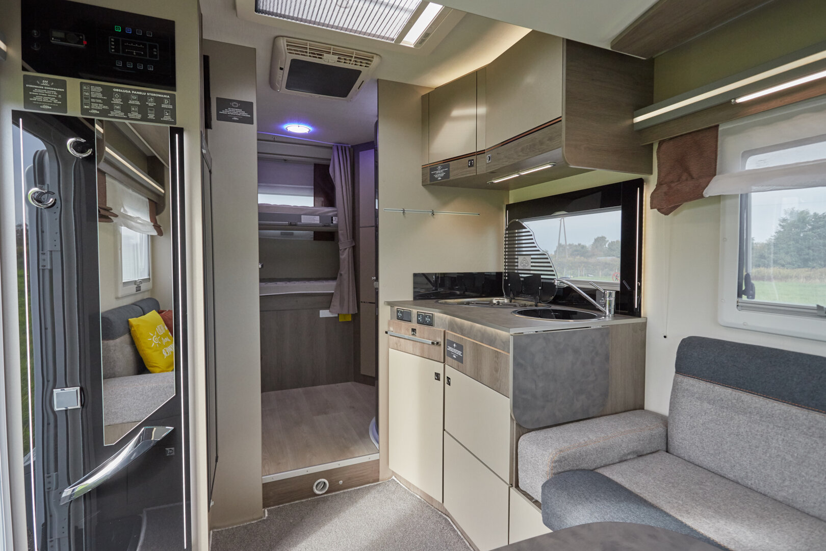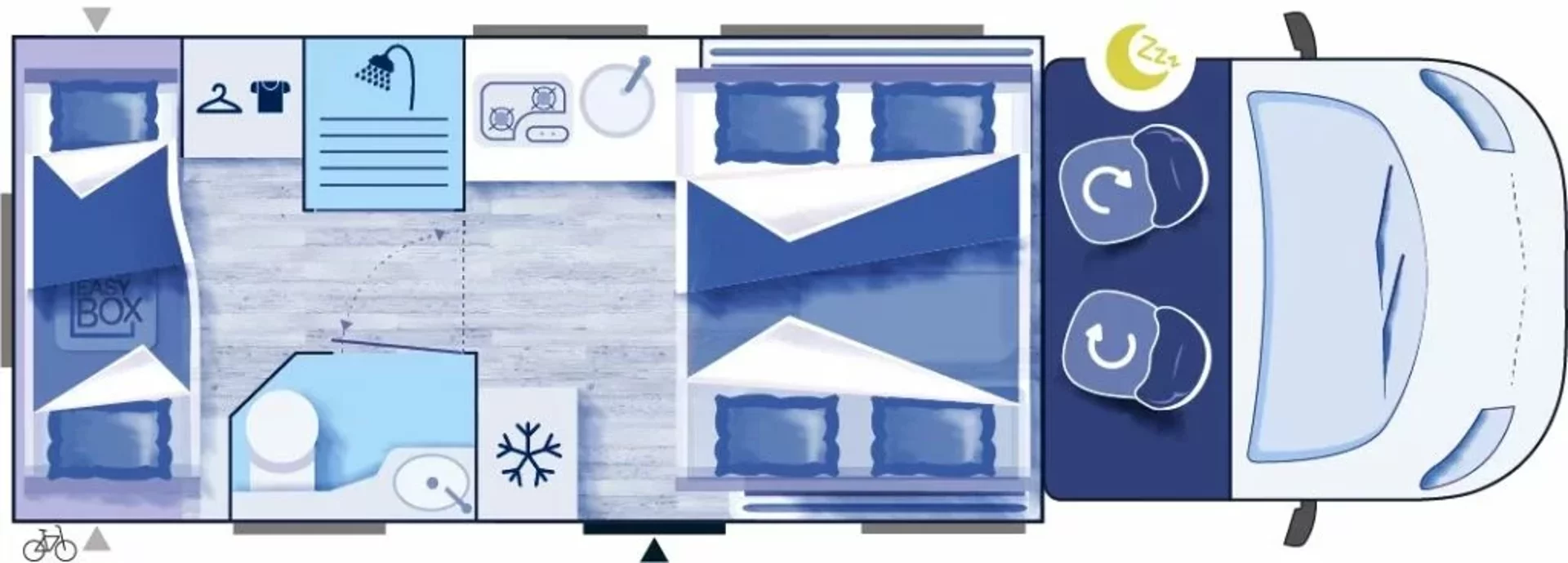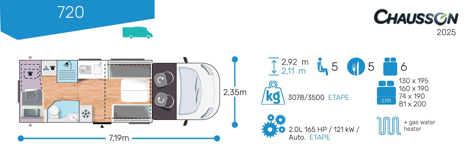 Ten niskoprofilowy kamper z salonem maxi twarzą w twarz i pięcioma siedzeniami do jazdy otwiera się w ciepłym i przyjaznym otoczeniu. Wyposażony w mnóstwo innowacji, zapewnia łatwe siedzenie dla pięciu osób i sprytne miejsca do spania. Ten nowy układ daje gwarancję komfortu zarówno w wersji dziennej, jak i nocnej.