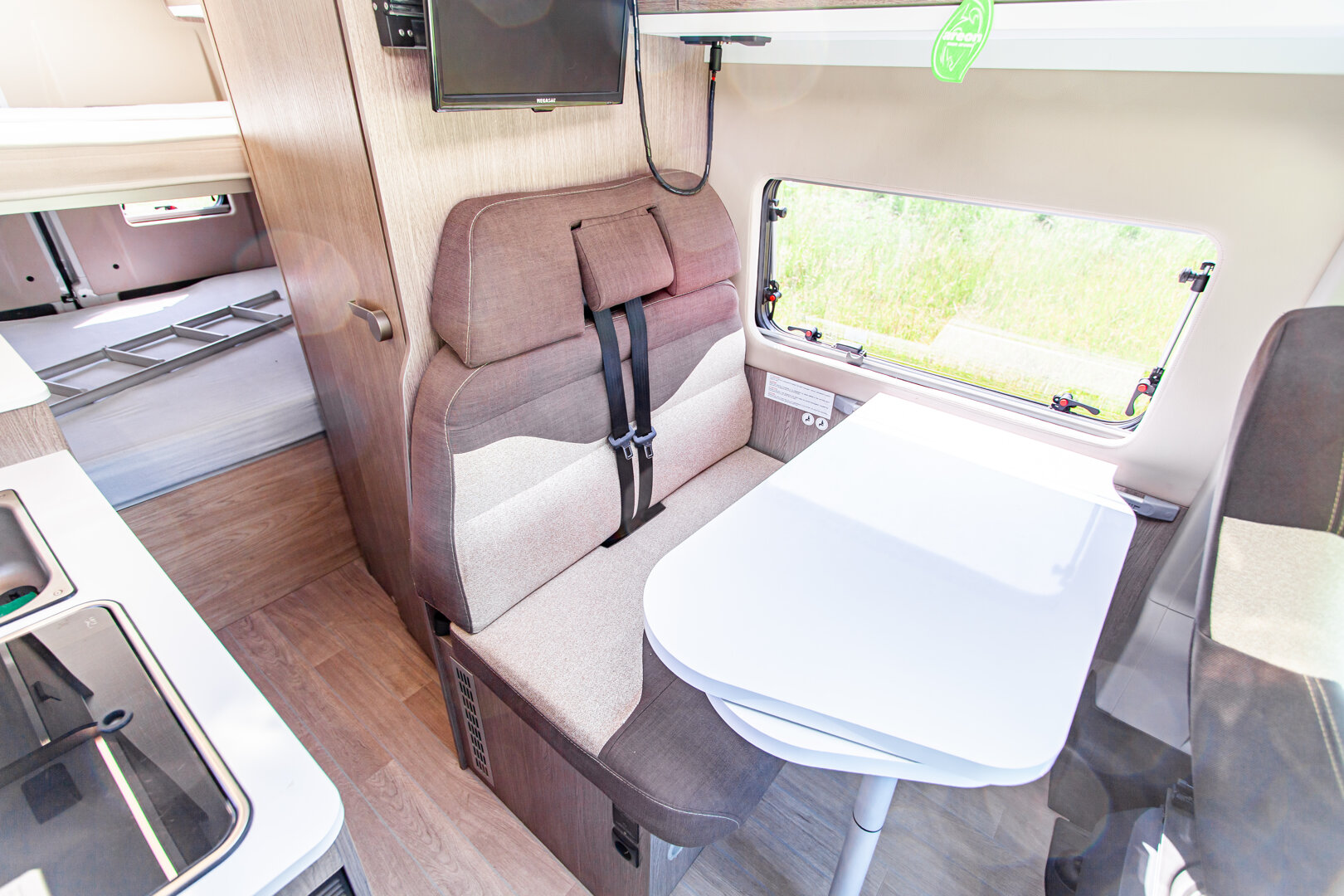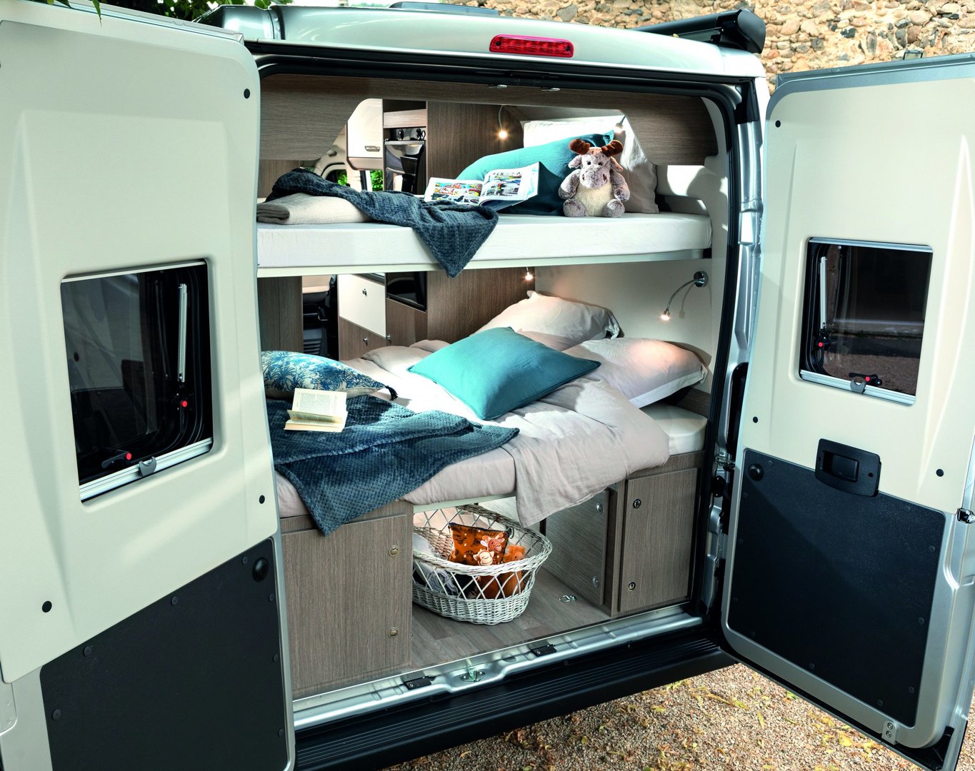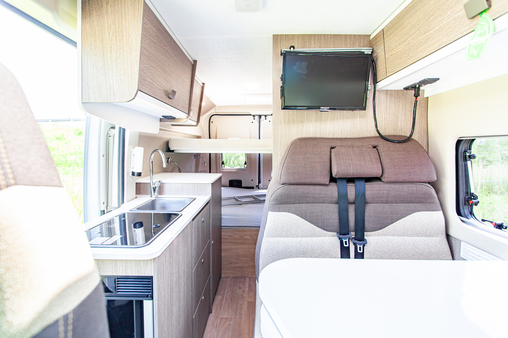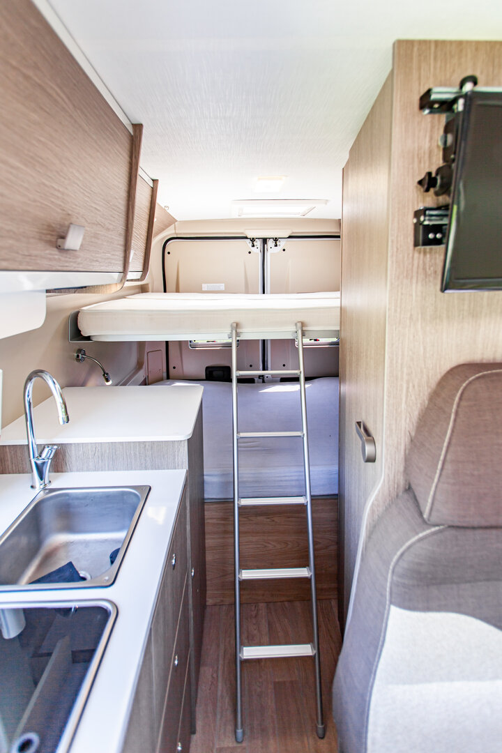 – Kapitańskie fotele z podłokietnikami - – Duże łóżko w tylnej części zabudowy (1860 x 1400 mm) + dodatkowe podwieszane (1830 x 1320 mm)
