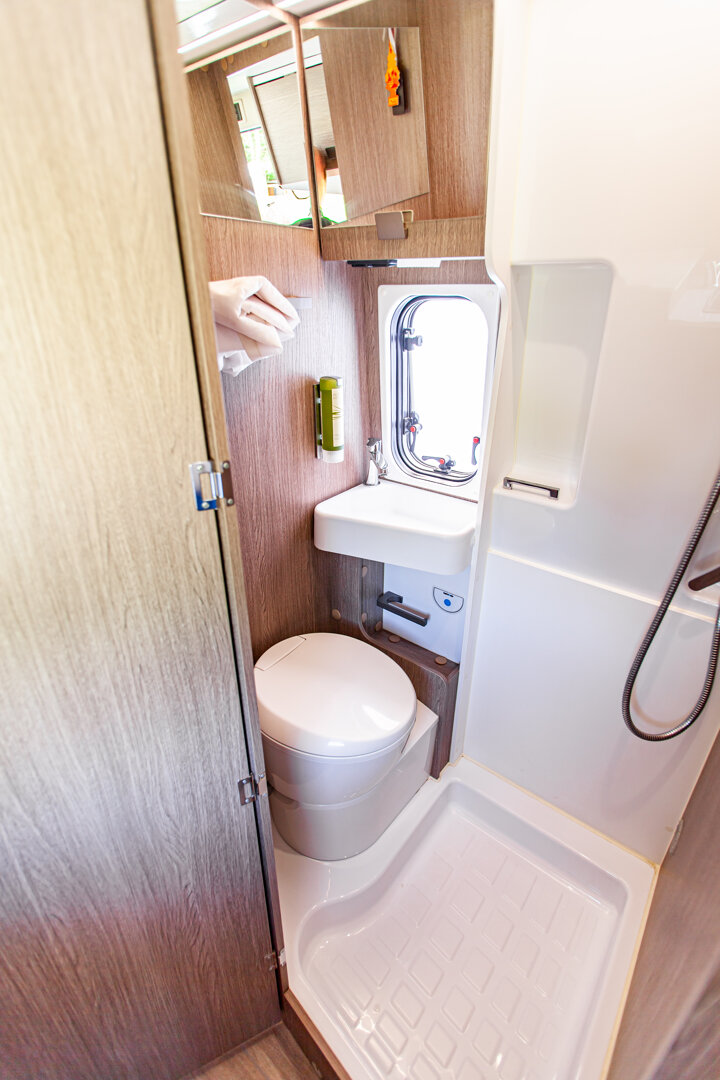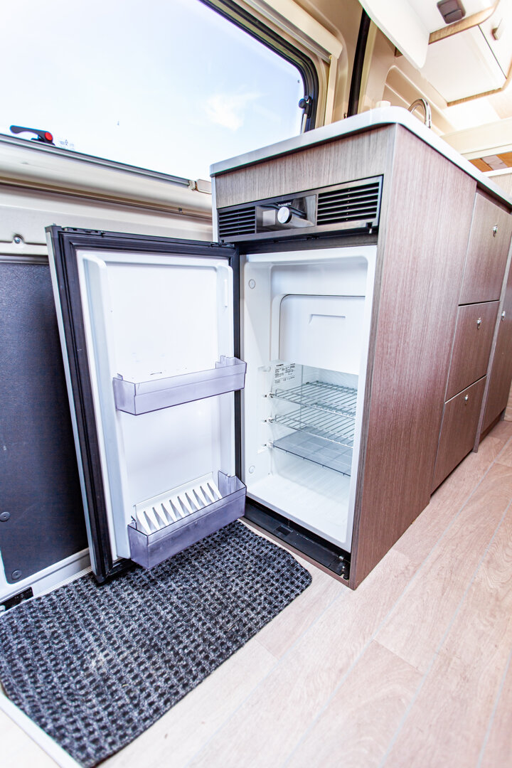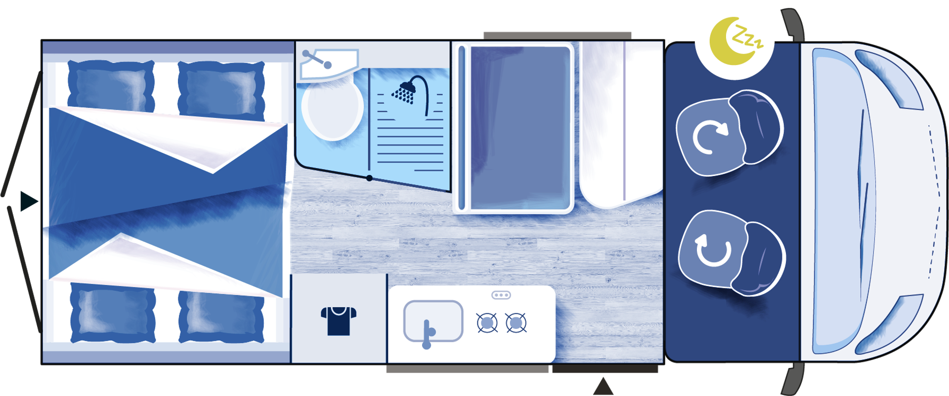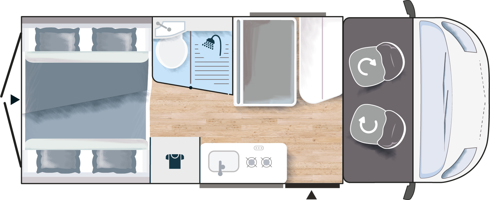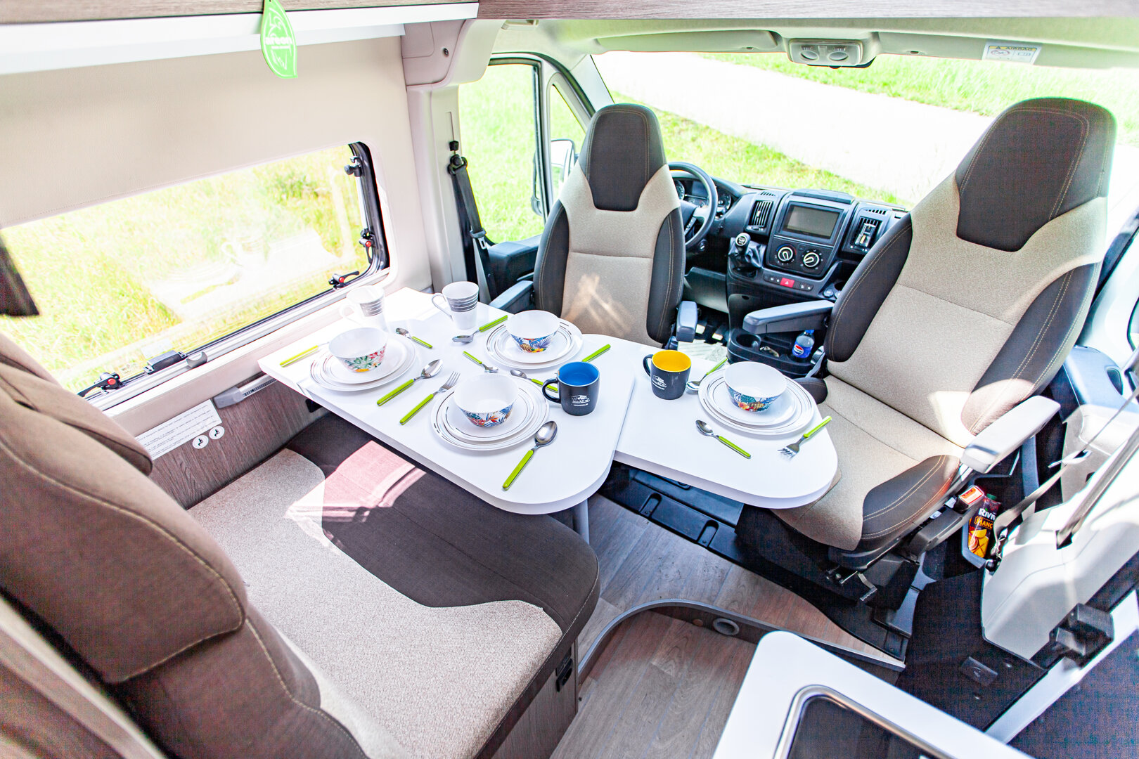 – Kapitańskie fotele z podłokietnikami - – Duże łóżko w tylnej części zabudowy (1860 x 1400 mm) + dodatkowe podwieszane (1830 x 1320 mm)